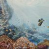 A stunningly colourful painting depicting a emerald-tinted wave crashing on the beach. The sunset is framed with heavy purple clouds, contributing to the dramatic look.